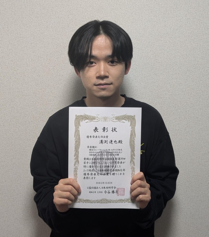 ④2024/12/2 2024M1 溝渕 進也 が日本材料学会関西支部第19回若手シンポジウム 優秀発表支部長賞を受賞。